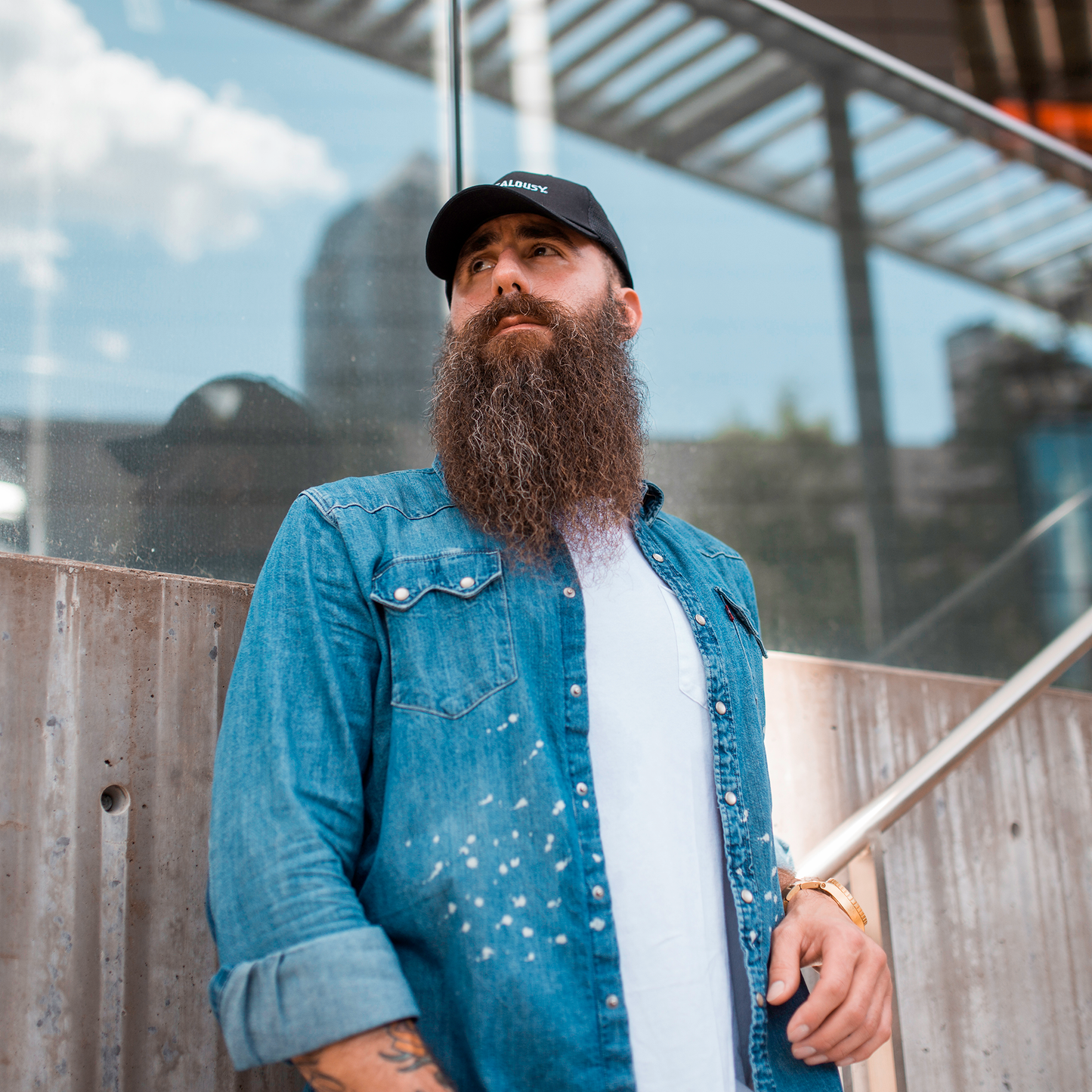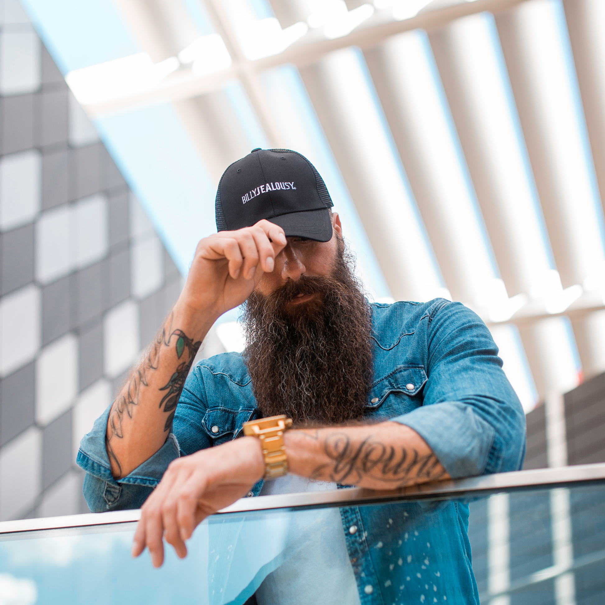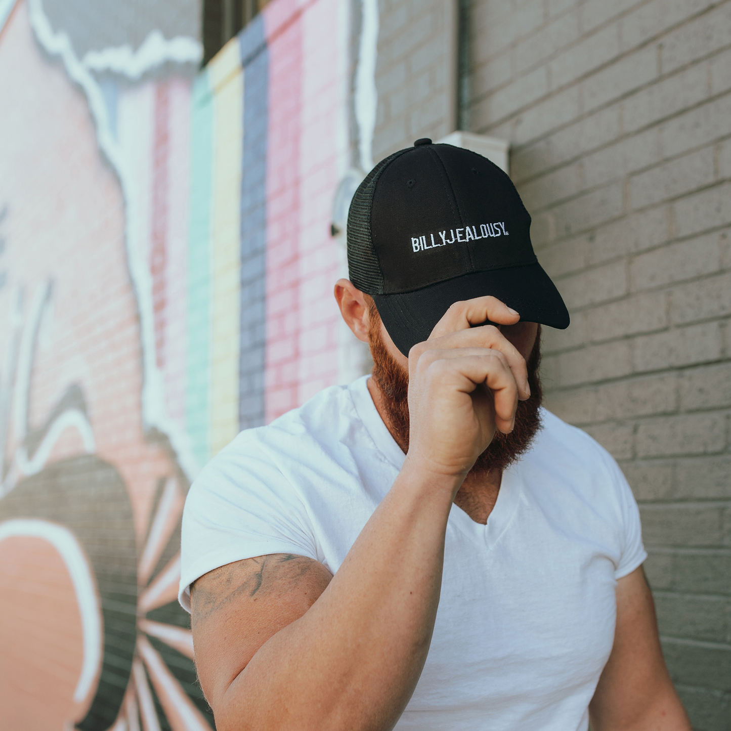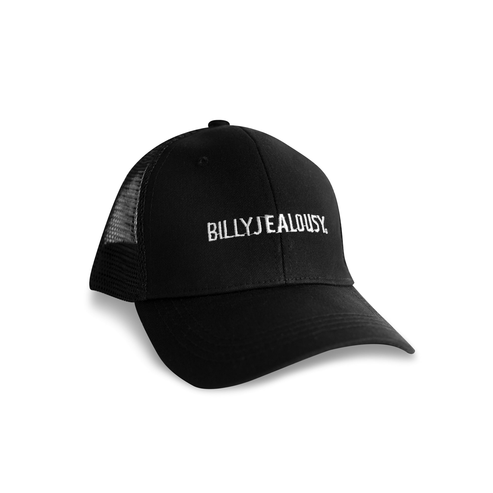 This all black hat features a white stitch embroidered Billy Jealousy logo for a clean and classic look. The traditional trucker hat construction features a solid front panel, breathable mesh back and side panels, and adjustable snap back sizing piece for a custom fit. Made from a cotton and polyester blend to ensure comfort and durability.